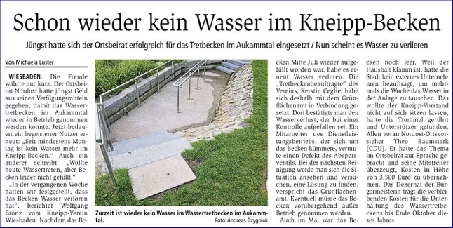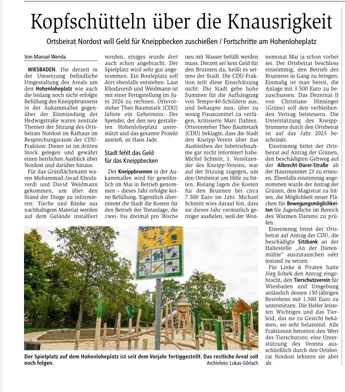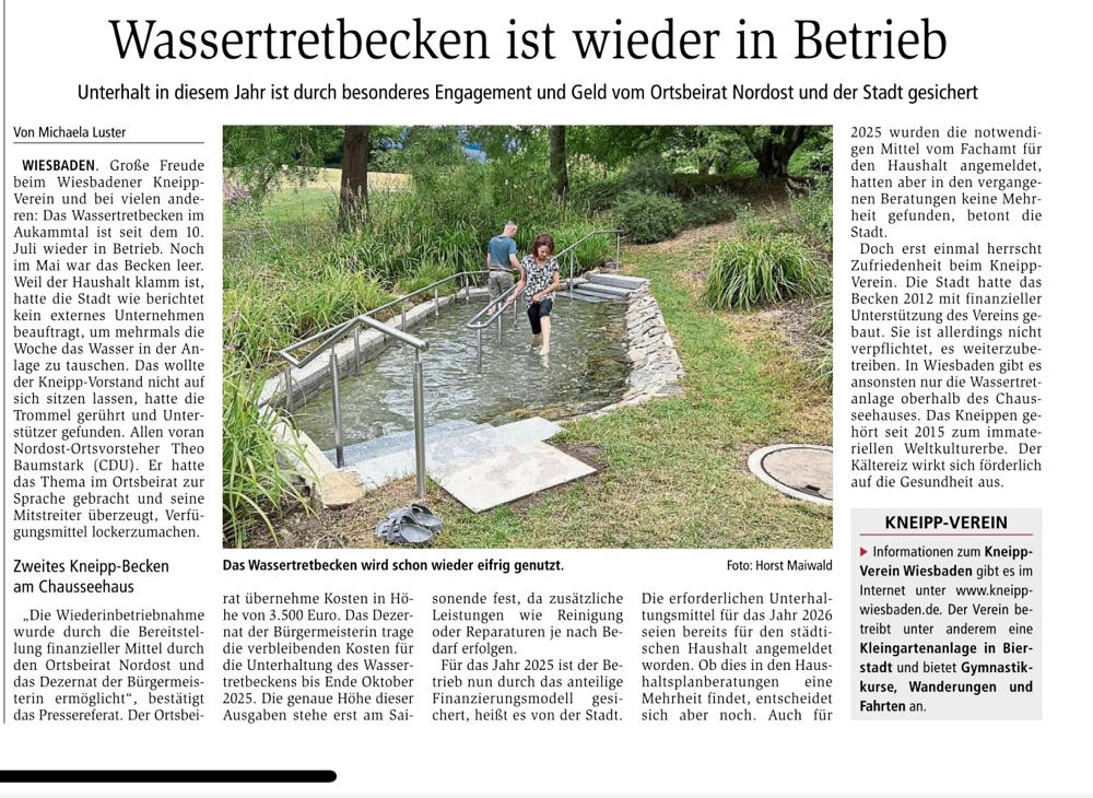 Nach Mitteilung des Grünflächenamtes vom 06.08.25 wurde "... festgestellt, dass der Schieber, der das Wasser im Becken halten soll, undicht ist. Die Fachfirma wurde bereits mit der Reparatur beauftragt, hat aktuell aber mitgeteilt, dass ein benötigtes Ersatzteil bestellt werden musste. Sobald dieses geliefert ist, wird die Reparatur zeitnah durchgeführt. Im Anschluss wird das Kneipp-Becken wieder befüllt und steht dann wieder zur Verfügung."